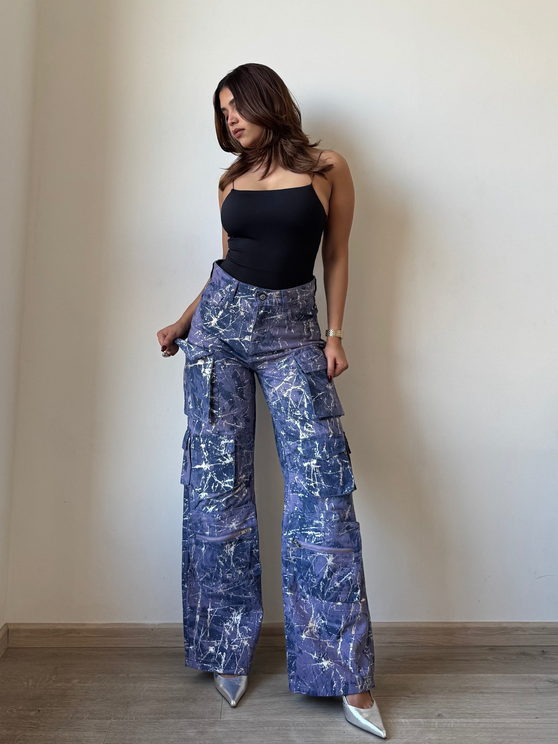 Indulge in luxury with our Milan High Street Foil Cargo Denim. These cargo jeans feature a unique foil design, perfect for a night out on the town. Made with high-quality denim, they offer both style and comfort. Upgrade your wardrobe with these exclusive jeans.